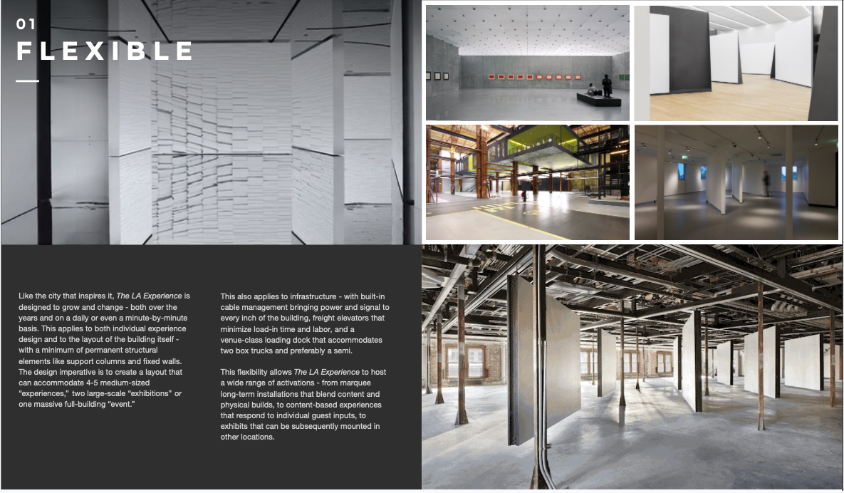 Like the city that inspires it, The LA Experience is designed to grow and change - both over the years and on a daily or even a minute-by-minute basis. This applies to both individual experience design and to the layout of the building itself - with a minimum of permanent structural elements like support columns and fixed walls. The design imperative is to create a layout that can accommodate 4-5 medium-sized “experiences,” two large-scale “exhibitions” or one massive full-building “event.”